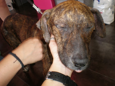 Para los que no conocen su historia, Aixa fue encontrada un día al lado de una carretera, tirada bajo el sol con todas las orejas llenísimas de garrapatas y todo el cuerpo lleno de pulgas, estaba desnutrida y deshidratada, a tan sólo unas horas de su muerte. La recogimos y la llevamos al veterinario de urgencia y estuvo ingresada casi una semana, con mucha diarrea por la deshidratación y sin poder levantarse de pie.