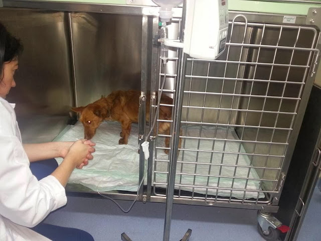 Este angelito es Peli. Ahora mismo está ingresado y su futuro es muy incierto, ya que tiene las vertebras rotas y el nervio dañado, anemia y estamos esperando los resultados de Leptospirosis que es una enfermedad k suelen coger los perros de caza por comer alimentos crudos o beber de charcos, tiene los valores hepaticos muy altos pero el higado lo tiene bien .